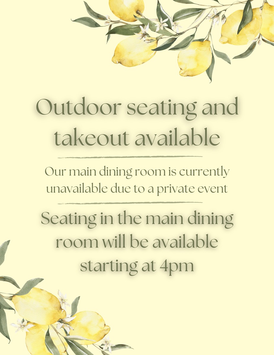 ☀️Outdoor seating and takeout are available. Our main dining room is reserved for a private event and will be welcoming guests again starting at 4 PM. We look forward to serving you!